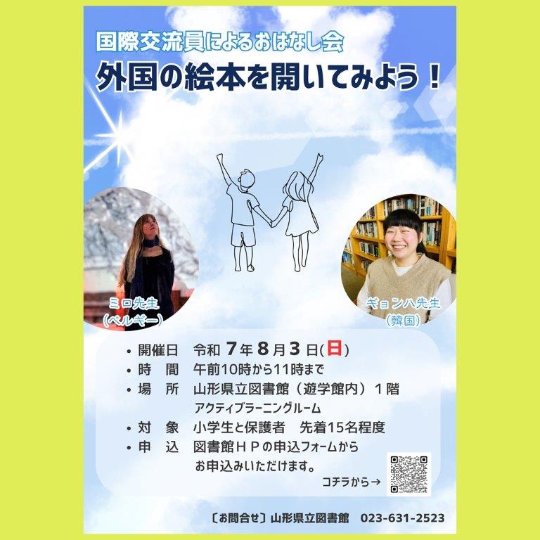 韓国、ベルギーの国際交流員が、日本語による説明を交えながら、外国絵本の読み聞かせを行います。 そのほかにも夏の工作にピッタリのアクティビティを準備しています!今回はチョンサチョロン(韓国の伝統的な提灯)と海岸のきれいな花を作ります。とっても素敵で華やかな作品ができるので、ぜひ一緒に作ってお家に飾ってみませんか? 参加ご希望の方は必要事項を入力のうえお申し込みください。 ☆ 日時:令和7年8月3日(日) 午前10時から11時まで☆ 場所:山形県立図書館(遊学館内)1階 アクティブラーニングルーム ☆ 対象:小学生とその保護者 先着15名(小学生のみの参加も可能です。) ☆ お申込み 県立図書館HP内「お知らせ」の参加申込みフォームから |