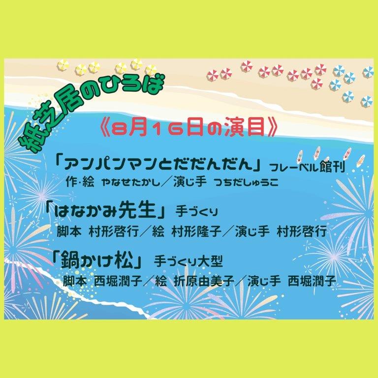 今回は、現在朝ドラでも話題の「アンパンマン」のお話をします。アンパンマンはどんな怪物と戦うのかな? ほかの2作品は紙芝居研究会の方々の手づくり紙芝居。天童に実在した“はなかみ”先生のお話と、山形県民のソウルフード!芋煮のお話をお届けします。 親子はもちろん、大人おひとりでの参加も大歓迎です! 当日のご来館をお待ちしています(申込不要) ☆ 日時:令和7年8月16日(土) 10時30分から11時15分まで ☆ 場所:山形県立図書館(遊学館内)1階 アクティブラーニングルーム(定員20名程度) ☆ 演目:「アンパンマンとだだんだん」(フレーベル館刊) 作・絵/やなせたかし 演じ手/つちだしゅうこ 「はなかみ先生」(手づくり) 脚本/村形啓行 絵/村形隆子 演じ手/村形啓行 「鍋かけ松」(手づくり大型) /西堀潤子 絵/折原由美子 演じ手/西堀潤子 |