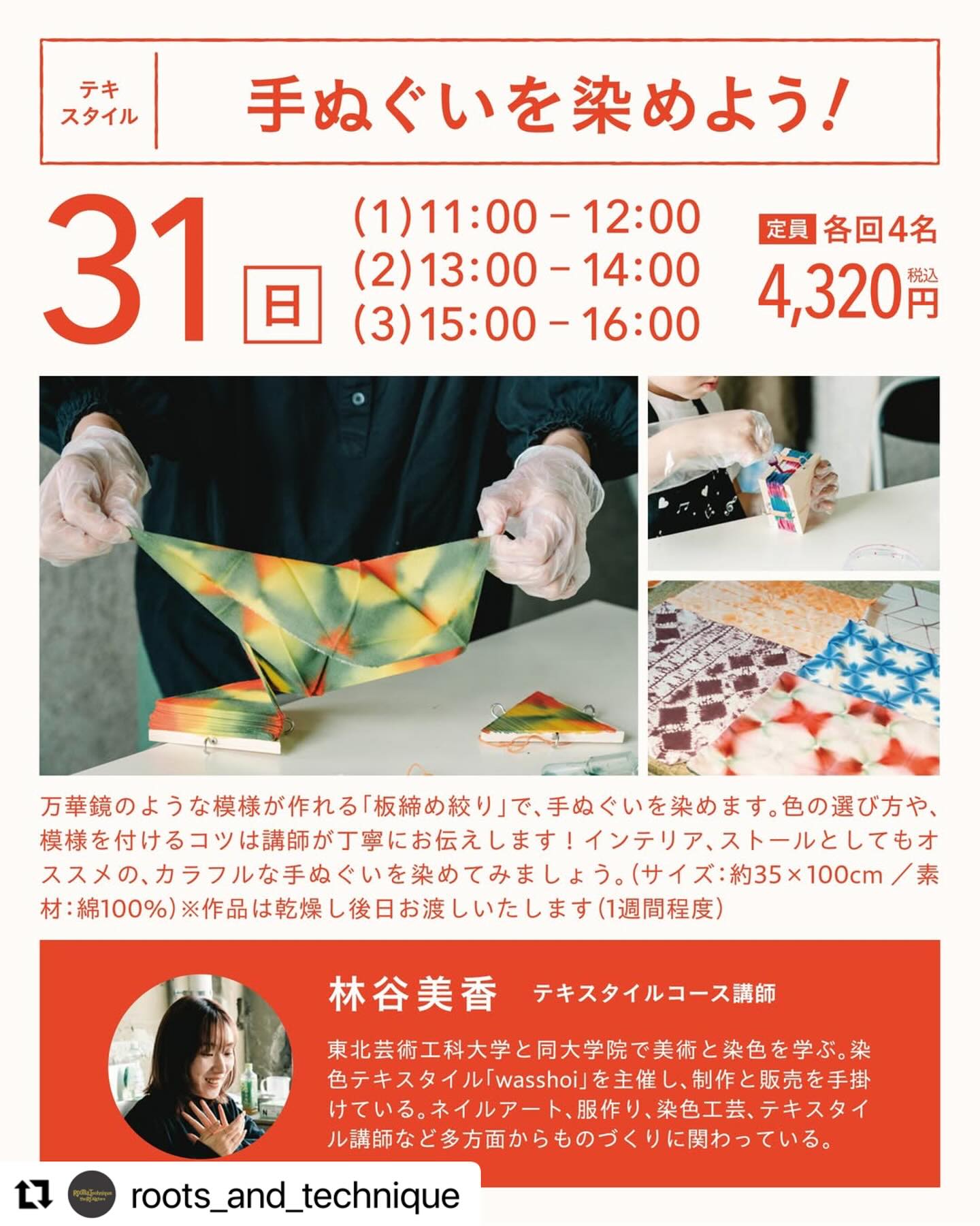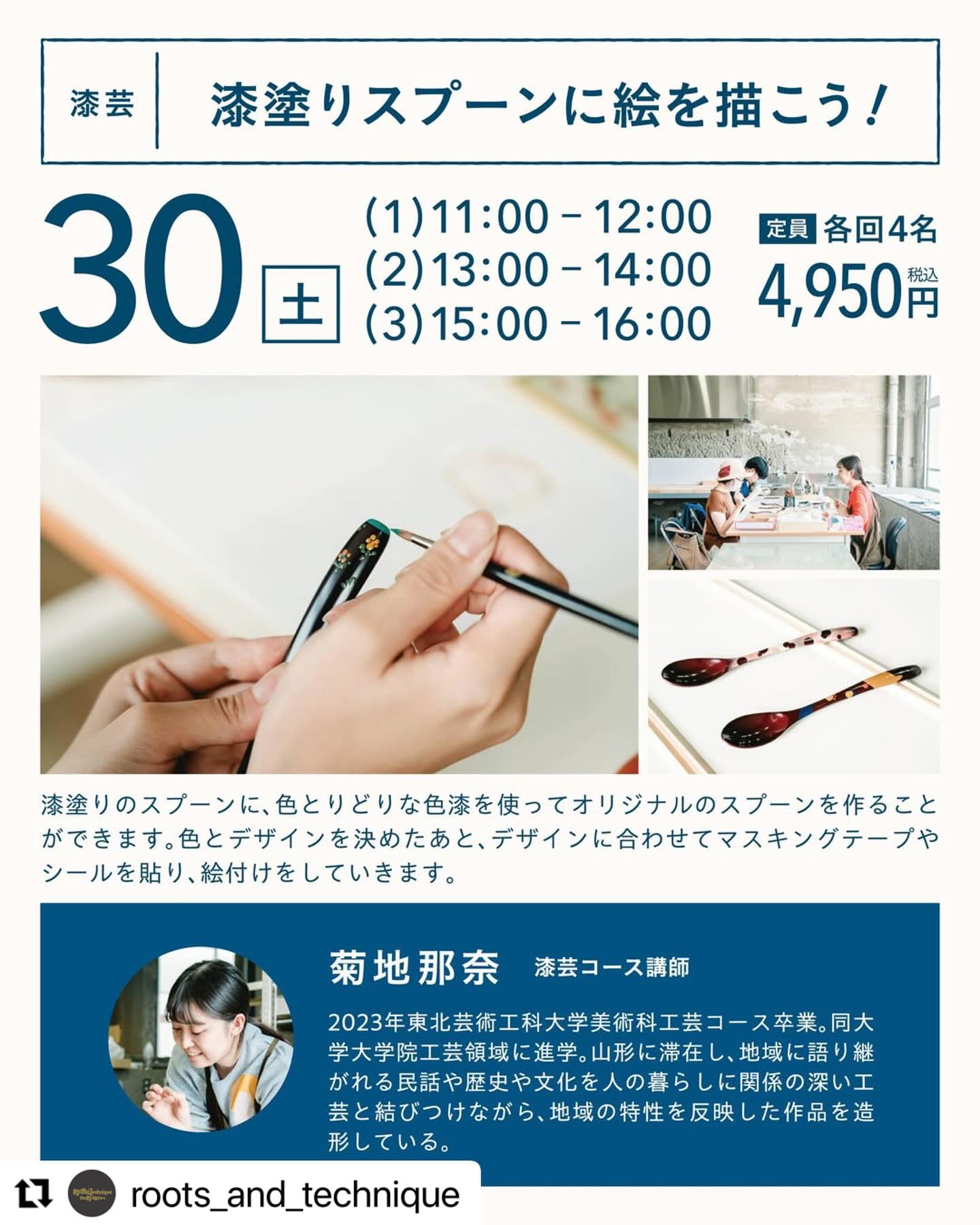 【陶芸コース】グラタン皿を作ろう! 授業日時:2025年8月30日[土]①11:00〜13:00 ②13:30〜15:30 ③16:00〜18:00 【テキスタイルコース】手ぬぐいを染めよう! 授業日時:2025年8月31日[日]①11:00〜12:00 ②13:00〜14:00 ③15:00〜16:00 【漆芸コース】漆塗りスプーンに絵を描こう! 授業日時:2025年8月30日[土]①11:00〜12:00 ②13:00〜14:00 ③15:00〜16:00 |