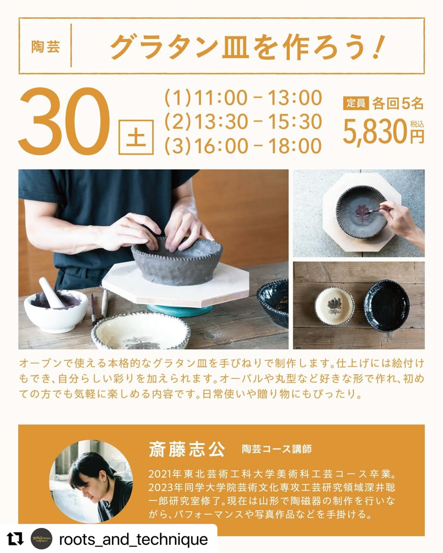 クラフトのルーツと技術を学ぶ学校「ROOTS & School」。2025年8月開講分の受付を開始いたしました! 全3コース、3クラスの授業が展開されます。ご参加をご希望される方は、各詳細をご確認の上お申し込みください。みなさまのご参加心よりお待ち申し上げます。 詳細とお申込みはQ1webサイトへ —— 【陶芸コース】グラタン皿を作ろう! オーブンで使える本格的なグラタン皿を手びねりで制作します。仕上げには絵付けもでき、自分らしい彩りを加えられます。オーバルや丸型など好きな形で作れ、初めての方でも気軽に楽しめる内容です。日常使いや贈り物にもぴったり。 授業日時:2025年8月30日[土]①11:00〜13:00 ②13:30〜15:30 ③16:00〜18:00 授業時間:120分 定員:各回先着5名 受講料:5,830円[税込] 【テキスタイルコース】手ぬぐいを染めよう! 万華鏡のような模様が作れる「板締め絞り」で、手ぬぐいを染めます。色の選び方や、模様を付けるコツは講師が丁寧にお伝えします!インテリア、ストールとしてもオススメの、カラフルな手ぬぐいを染めてみましょう。(サイズ:約35×100cm/素材:綿100%) 授業日時:2025年8月31日[日]①11:00〜12:00 ②13:00〜14:00 ③15:00〜16:00 授業時間:60分 定員:各回先着4名 受講料:4,320円[税込] ※作品は乾燥し後日お渡しいたします(1週間程度) 【漆芸コース】漆塗りスプーンに絵を描こう! 漆塗りのスプーンに、色とりどりな色漆を使ってオリジナルのスプーンを作ることができます。色とデザインを決めたあと、デザインに合わせてマスキングテープやシールを貼り、絵付けをしていきます。 授業日時:2025年8月30日[土]①11:00〜12:00 ②13:00〜14:00 ③15:00〜16:00 授業時間:60分 定員:各回先着4名 受講料:4,950円[税込] ■受講の流れ 1.事前申込がおすすめです。コースを選択し、Q1 ONLINE STORE よりお時間を選択の上お申し込みください。 2.お申し込み情報の入力と事前決済をお願いいたします。 3.当日、1階運営事務所までお越しください。スタッフが教室会場をご案内・教室スタート! ■留意事項 ・汚れても良い服装でお越しください(エプロンの持参をおすすめします) ・作品のお渡しについては講師からご案内します(約 1ヶ月後の予定)。お受け取りは、Q1運営事務所または着払いによる郵送となります。 ・お申し込み後の変更・キャンセルはお受けできませんので、ご了承ください。 ■お子様と一緒に受講される場合 お子様(3歳以上小学生以下)と保護者の方が一緒に受講される場合は、受講される人数分のお申し込みをお願いいたします。保護者の方が受講はせず付き添いだけの場合は受講料は頂戴いたしません。その旨をお知らせください。制作スペースに限りがございますので何卒ご理解のほどよろしくお願いいたします。 ■問い合わせ先 メールにてお問い合わせください(ras@qichi.jp) |