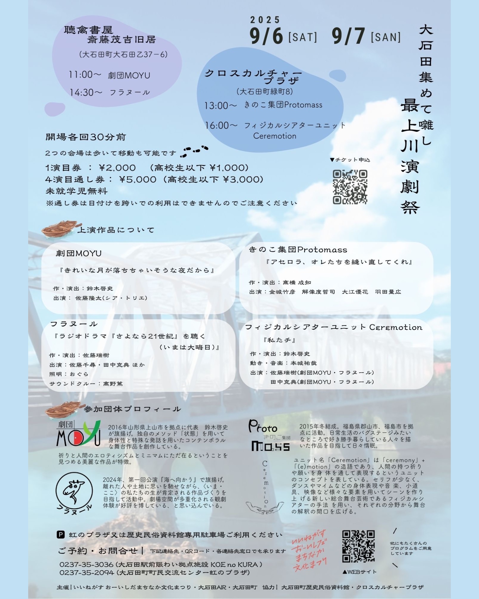 ※開場は各回30分前 ※各団体1演目は60分以内を予定しています 聴禽書屋 斎藤茂吉旧居 (大石田町大石田乙37−6) 大石田駅より徒歩約13分 / 虹のプラザより約9分 11:00〜 開演 劇団MOYU 14:30〜 開演 フラヌール クロスカルチャープラザ (大石田町緑町8) 大石田駅より徒歩約7分 / 虹のプラザより約1分 13:00〜 開演 きのこ集団Protomass 16:00〜 開演 フィジカルシアターユニットCeremotion |