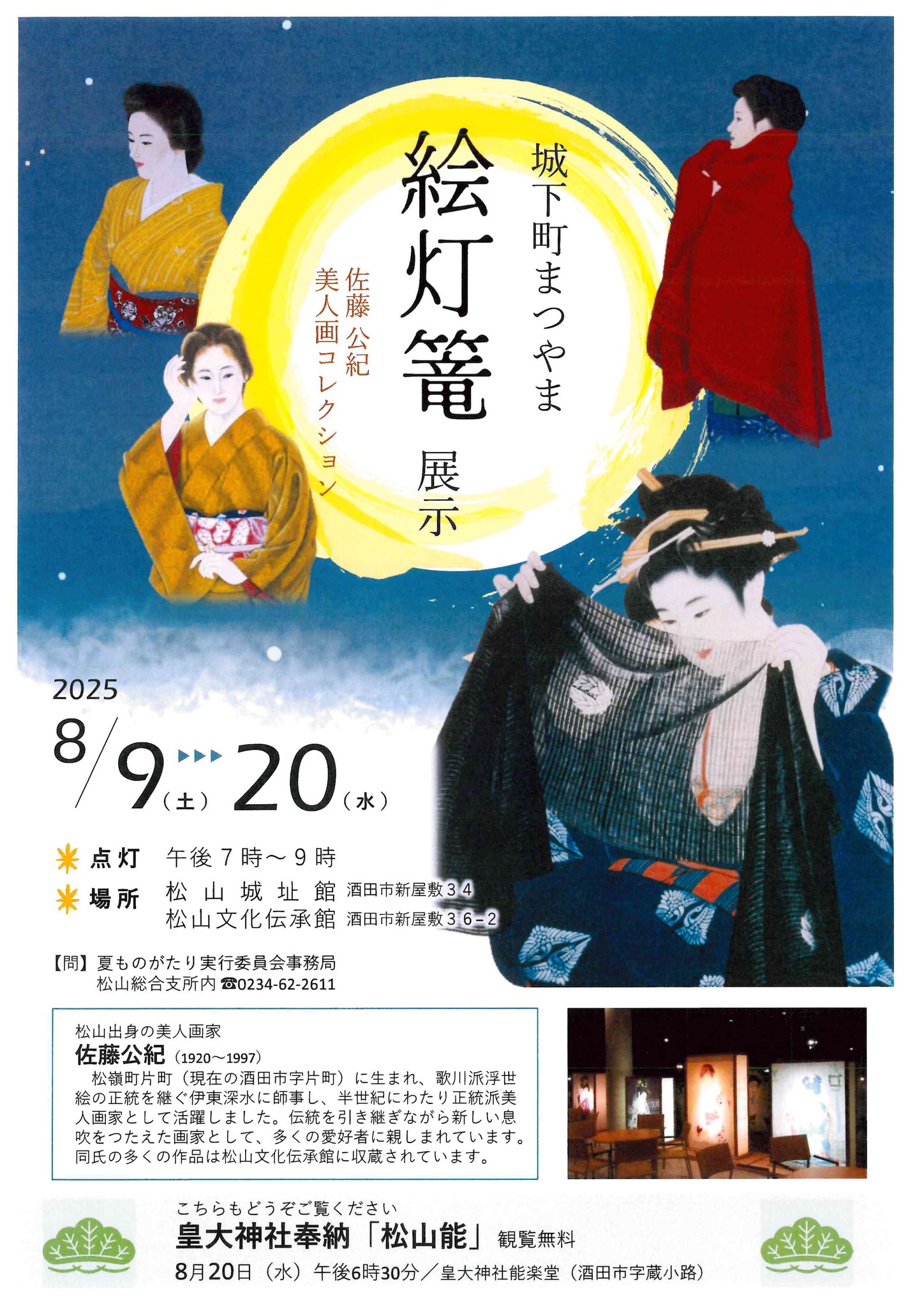 美人画大型絵灯篭の展示とライトアップを行います。 松山地域出身の画家・佐藤公紀氏(1920-1997年)が手掛けた美人画が描かれている絵灯篭は、 夜間には幻想的な灯りがともり、日中とはまた違った美しさを楽しむことができます。 松山地域夏の風物詩、美人画絵灯篭を見に是非ご来訪ください。 |