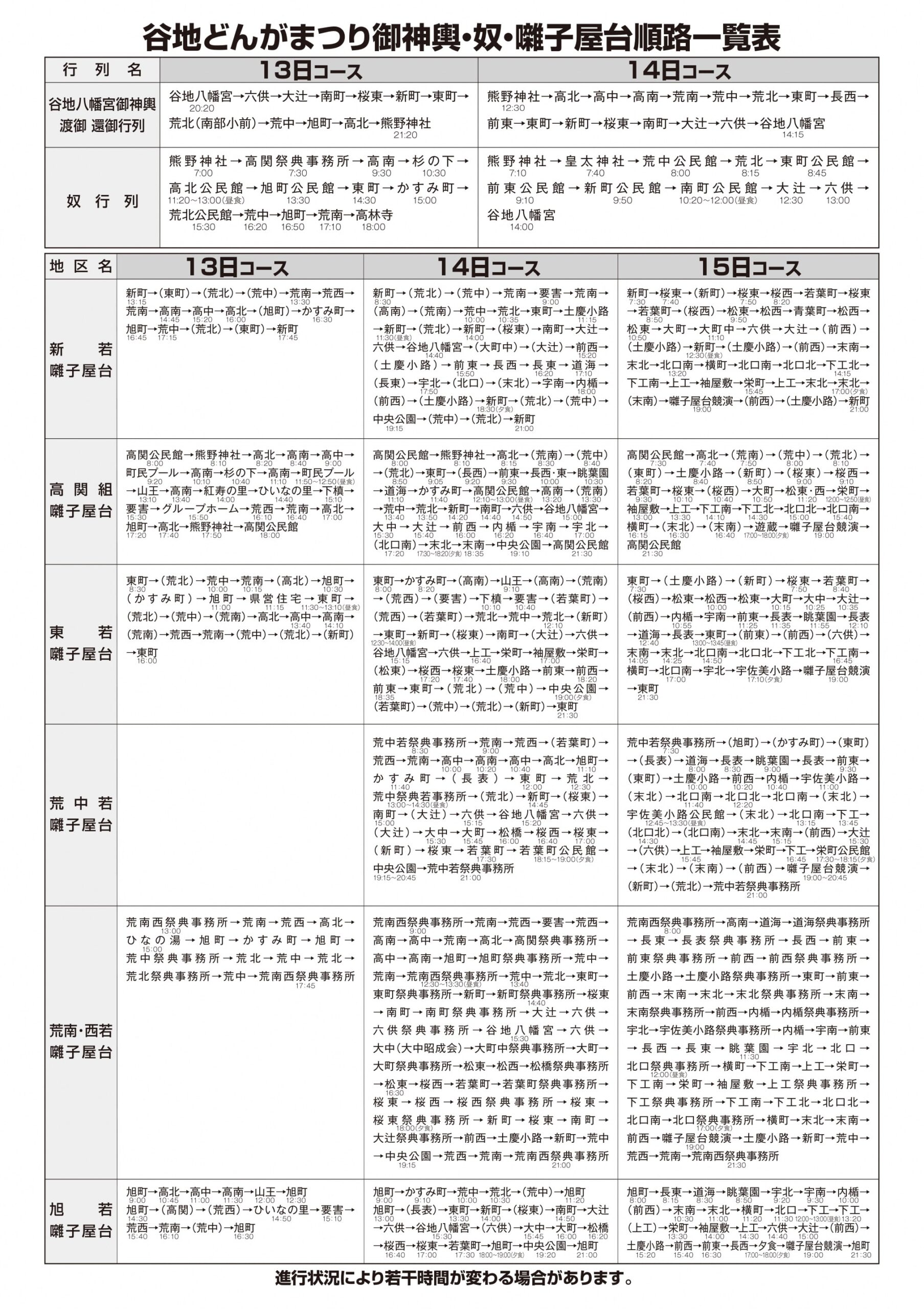【9月13日(土)】 終日 奴・囃子屋台巡演 14:30 林家舞楽奉奏 19:50 夜遊の舞楽 20:20 御神輿渡御 【9月14日(日)】 終日 奴・囃子屋台巡演 12:30 神輿還御 14:45 林家舞楽奉奏(解説付き) 17:15 谷地八幡宮例大祭奉幣式 【9月15日(月・祝)】 終日 囃子屋台巡演 13:00 各種奉納行事 18:00 伝統行事競演開会 |