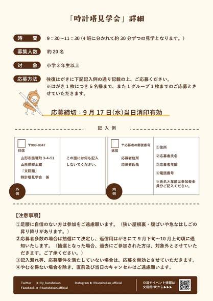 ![]() ![]() 開館30周年を迎える今年は、文翔館デジタルスタンプラリー・時計塔見学会・記念講演会・文翔館ハロウィンナイトなどイベント盛り沢山! 是非この機会にご来館ください 【事前応募制】 応募締切:9月17日(水)当日消印有効 ※応募者多数の場合抽選 【事前申込制】 申込締切:10月3日(金) 17:00まで 応募方法・申込方法の詳細は文翔館HPをご確認ください |