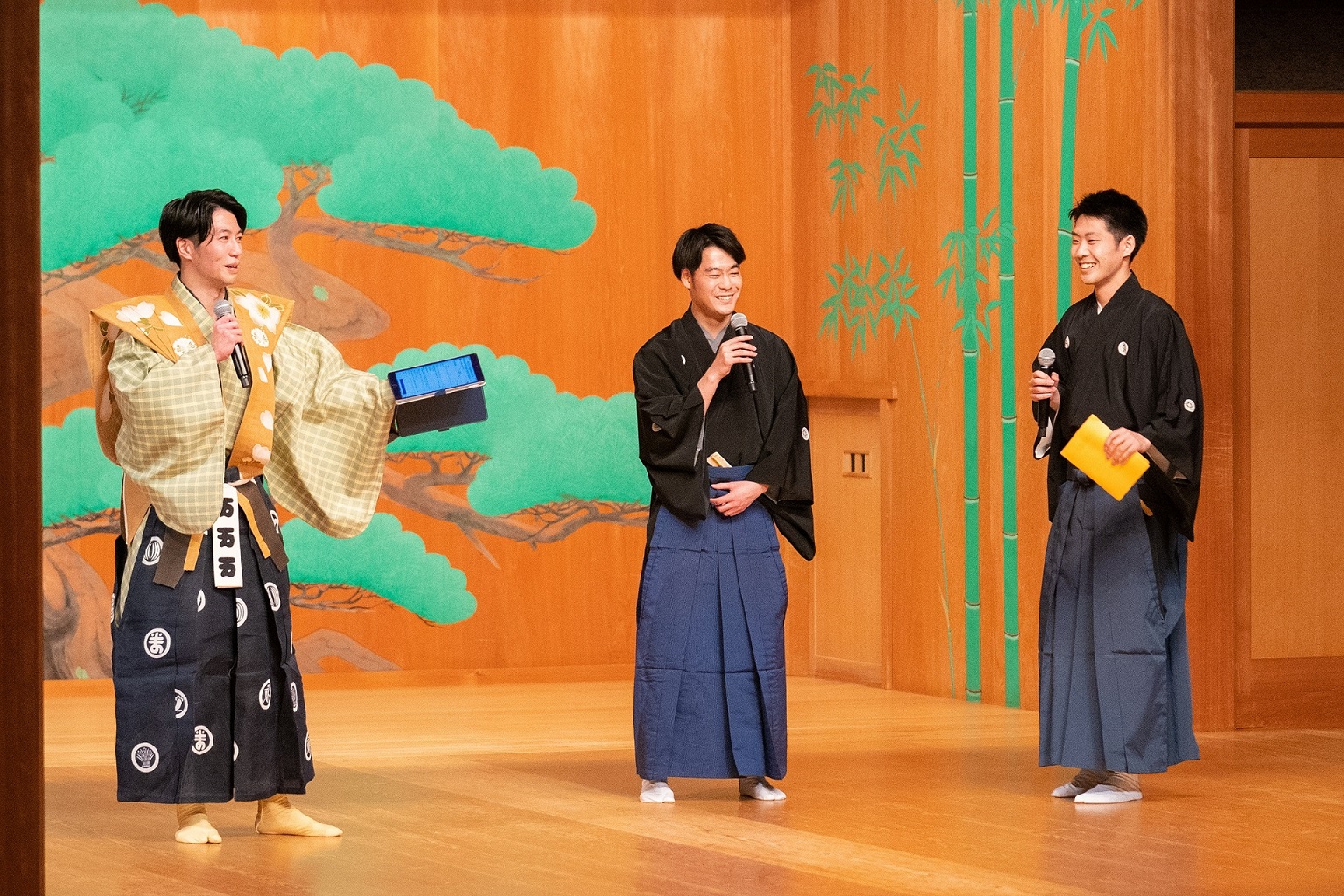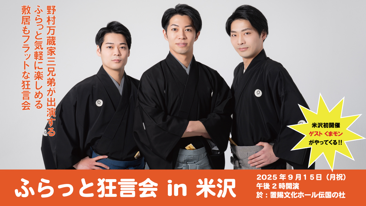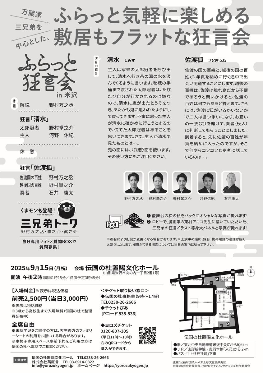 人気漫画家・東村アキコさんのイラストパネル展示 ふらっと狂言会のために描き下ろしていただきました。会場内にパネルを展示しフォトスポットとしてお楽しみいただきます。 【1】ふらっと♭な鑑賞講座 狂言「清水」「佐渡狐」の上演にあわせて、若い世代にわかりやすく「ふらっと」な言葉を選んで行われるトークがとっても好評。より気軽にお楽しみいただけます。 【2】ふらっと♭な体験講座 伝統芸能の稽古というとお堅いイメージがあって、つい自らの心にバリアーを作ってしまっている人もいるかもしれません…。この日、伝国の杜能舞台には「お稽古に挑戦したい!!!」と特別なあの人?が弟子入りをする予定。客席のお客様は、特別なあの人?が実際に指導を受ける様子を楽しむもよし。客席からご一緒に稽古体験もできます。自らの心のバリアーをなくして参加していただけること間違いなし!特別ゲストは後日発表予定。 【3】敷居を感じるひまなんてない! 人気狂言師はZ世代人! ■出演者