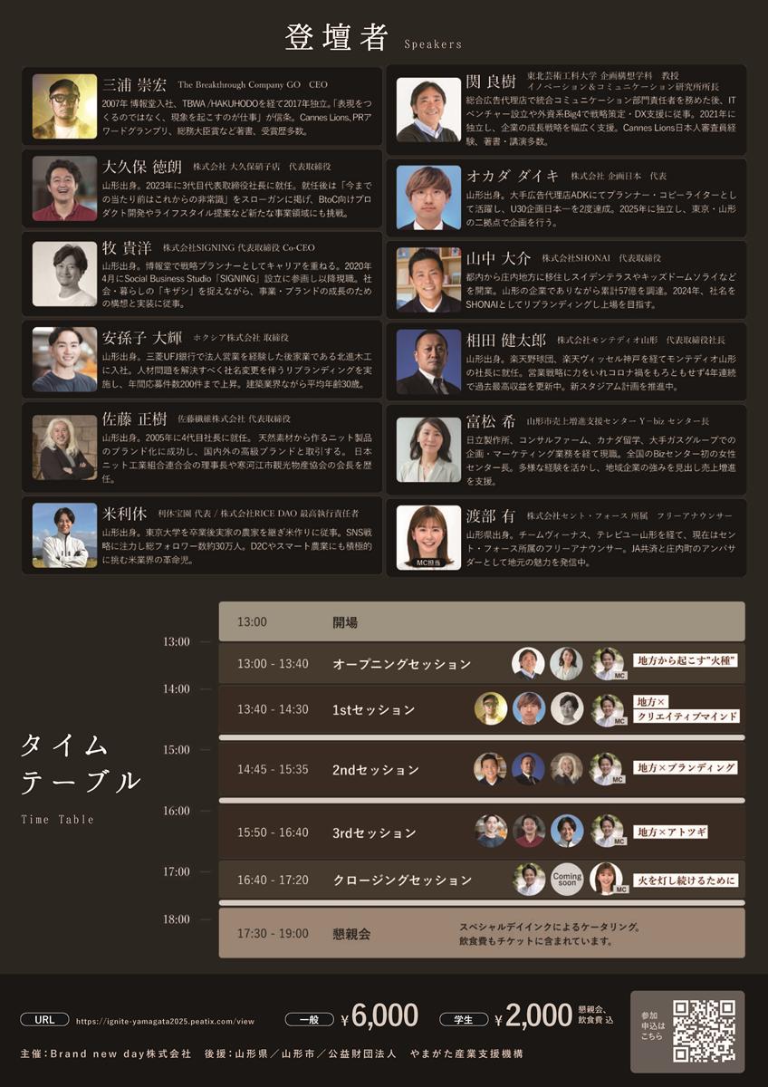 【名称】IGNITE YAMAGATA 2025 【主催】Brand new day 株式会社 【会期】2025年10月9日(木) 【対象】経営者・会社員・学生 【形式】リアル開催 【参加費】大人6000円・学生2000円(全て懇親会飲食費込) 【後援】山形県・山形市・公益財団法人 やまがた産業支援機構