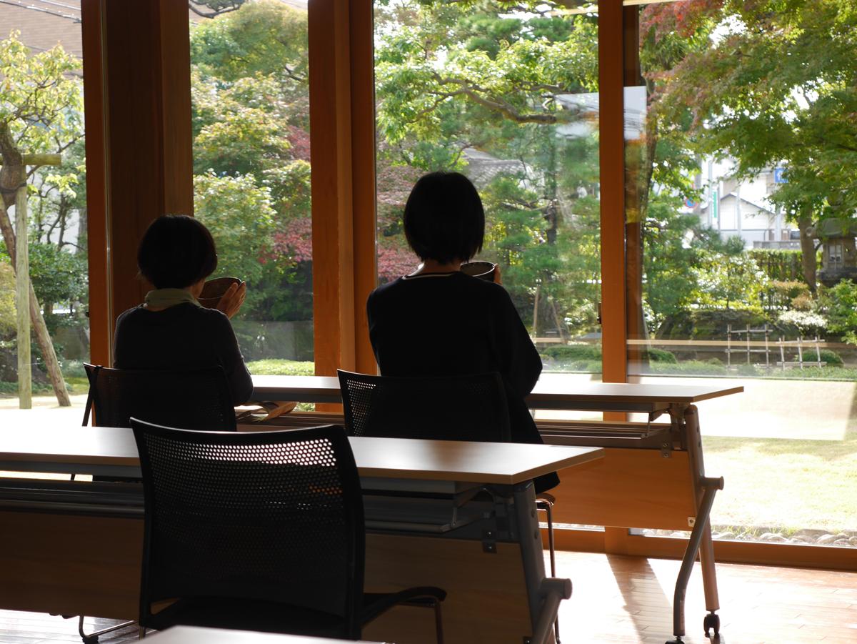 秋の深まり行く紅葉の庭園を鑑賞しながら、館内の椅子に座って、 |