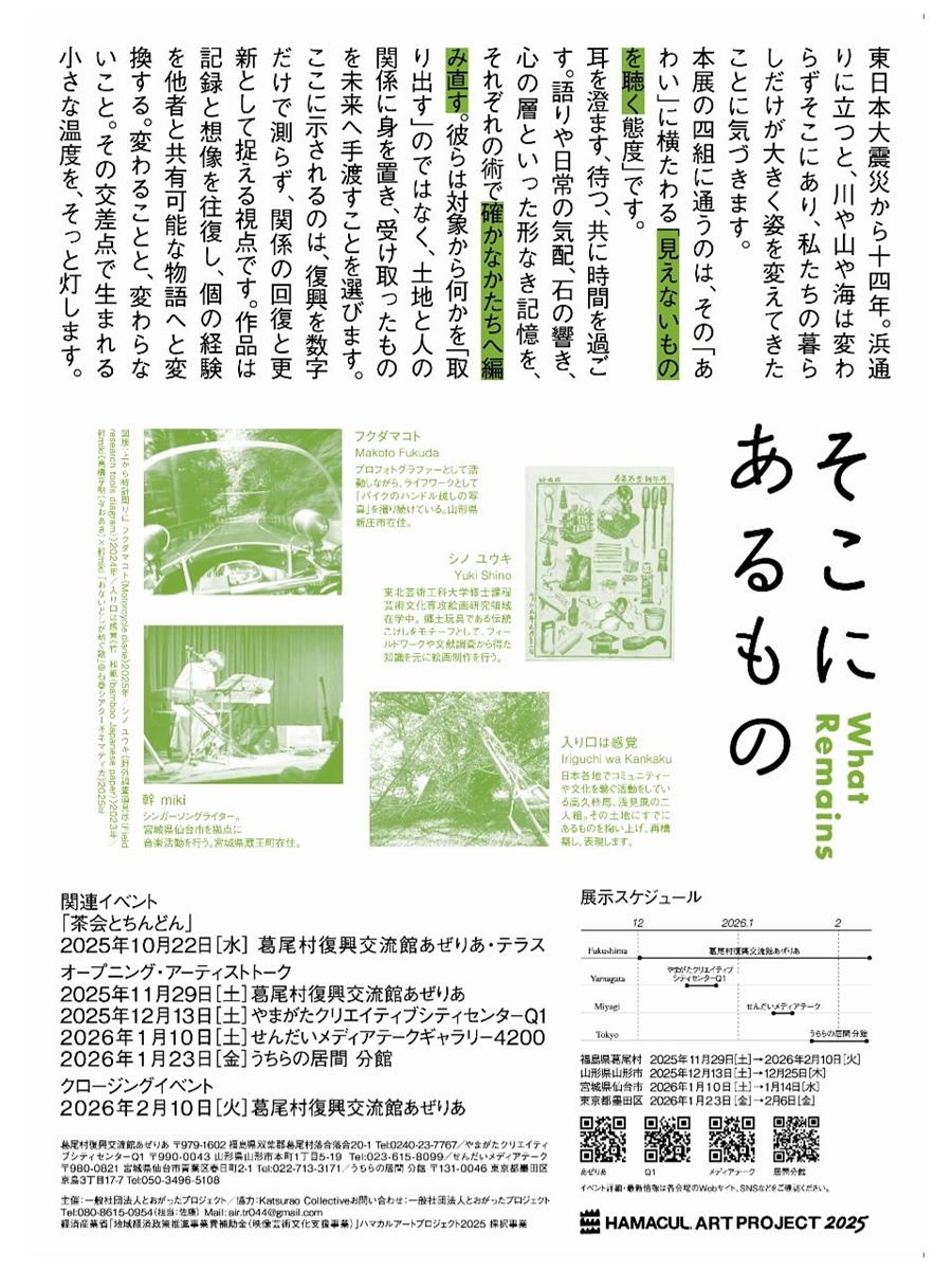 そこにあるもの / What Remains HAMACAL ART PROJECT 2025 成果展 会期/会場 ◆メイン展示 【福島】葛尾村復興交流館あぜりあ 2025年11月29日(土) − 2026年2月10日(火) ◆サテライト展示 【山形】やまがたクリエイティブシティセンターQ1 12月13日(土) − 12月25日(木) 【宮城】せんだいメディアテーク 1月10日(土) − 1月14日(水) 【東京】うちらの居間分館 1月23日(金) − 2月6日(金) 東日本大震災を経た浜通り地域を起点に、 「見えないものを聴く」ことをテーマにした展覧会です。 福島・宮城・山形・東京の四地域を巡りながら、 四組のアーティストが土地や人々との対話を通じて、記憶・風景・声を作品として編み直します。 変わるものと変わらないもの。 そのあわいに生まれる「ここにあるもの」を、ぜひ感じてください。 ◆Main Exhibition 【Fukushima】 Katsurao Village Reconstruction Exchange Center Azalea Nov. 29, 2025 (Sat) – Feb. 10, 2026 (Tue) ◆Satellite Exhibitions 【Yamagata】 Yamagata Creative City Center Q1 Dec. 13 (Sat) – Dec. 25 (Thu), 2025 【Miyagi】 Sendai Mediatheque Jan. 10 (Sat) – Jan. 14 (Wed), 2026 【Tokyo】 Uchira no Ima Bunkan Jan. 23 (Fri) – Feb. 6 (Fri), 2026 “What Remains” It has started in Fukushima coast area(Hamadori), a land shaped by both memory and transformation since 2011. Across four locations — Fukushima, Miyagi, Yamagata, and Tokyo — four artist groups engage in listening, dialogue, and reimagining. Their works explore the invisible threads connecting people, voices, and time, inviting us to sense what quietly remains between change and continuity. @hamacul_art_project @fukuda_makoto @miki1201sketch @fu.asami_ @shuma_takaku @19640607sk_2 @katsuraocollective @yamagata.q1 @ima_bunkan 主催:一般社団法人とおがったプロジェクト 採択事業:経済産業省 地域経済政策推進事業費補助金(映像芸術文化支援事業) 協力:Katsurao Collective,葛尾村,双葉町, 東日本大震災・原子力災害伝承館 |