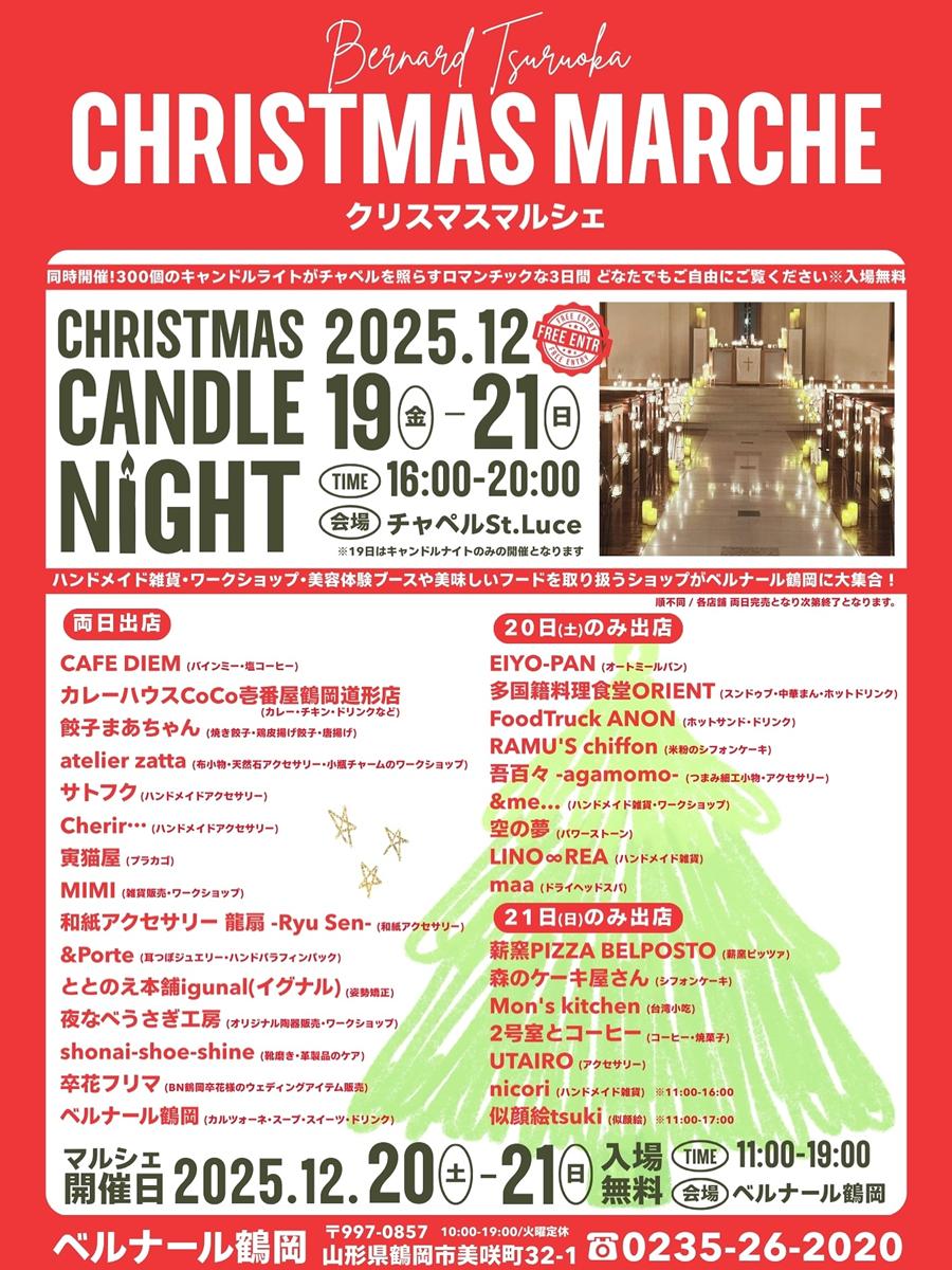 ベルナール鶴岡が、クリスマスのきらめきに包まれる3日間 12/19日(金)・20日(土)・21日(日) 3days 16:00~20:00 300個のキャンドルがチャペルを包む幻想的な空間へ ※19日はベルナール鶴岡のドリンク&フードのみ販売予定 12/20(土)・21(日) 2days 11:00〜19:00 ハンドメイド雑貨やワークショップ、この日だけのフードやドリンク 心も体も整うショップが両日合わせて30店舗も大集合する大イベント! 昼も夜も、特別なクリスマスを感じられる3日間 さむ~い冬はあたたかなベルナールの館内で ほっこりとしたひとときをお楽しみください 最新情報はストーリーズもしくはハイライトをチェック♡ |