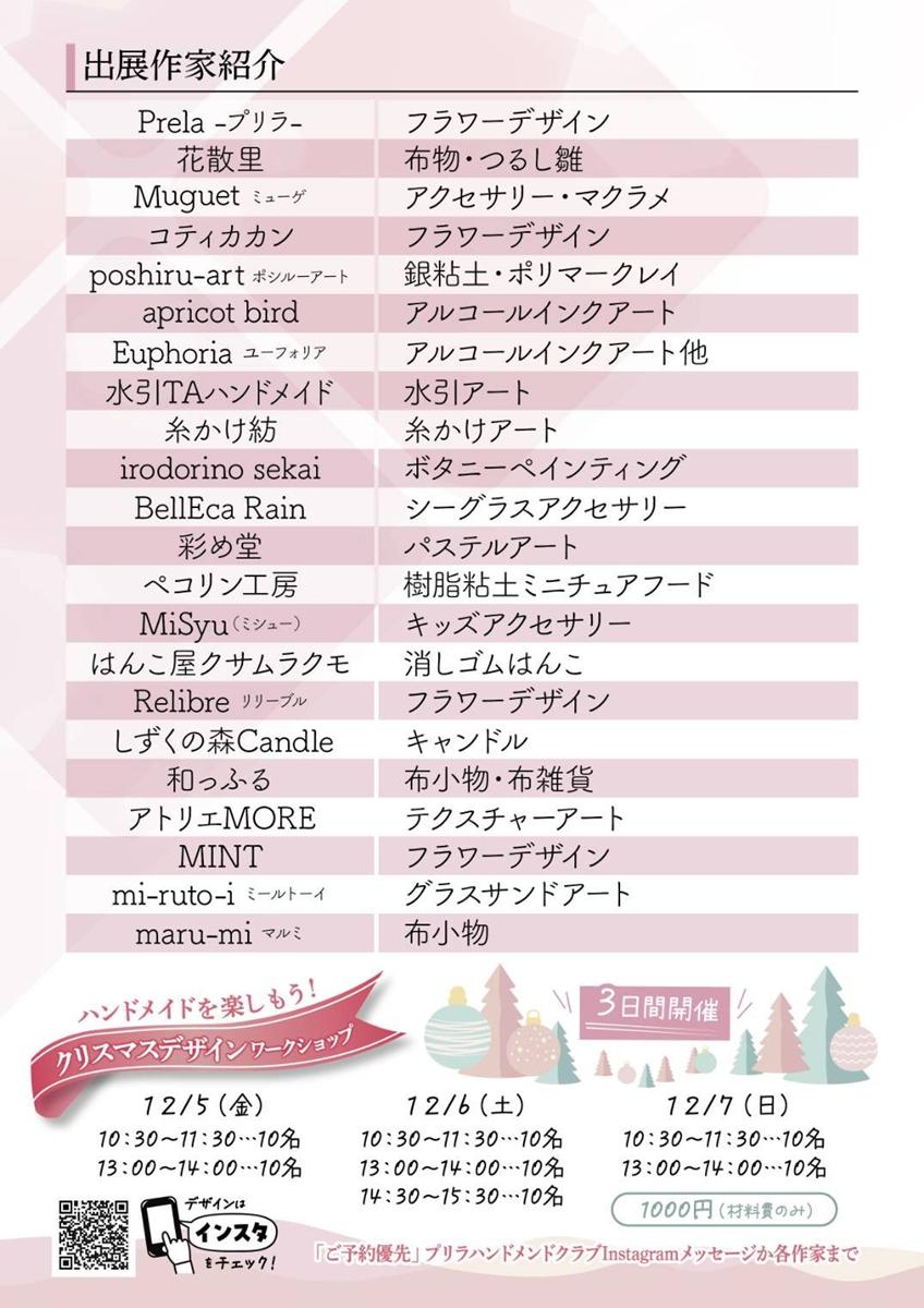 【第2回プリラハンドメイドクラブ グループ展】 文翔館ギャラリー3・4 にて3日間、開催いたします。 R7年度プリラハンドメイドクラブのメンバー有志が出展し、マルシェとはひと味違う作品や、いつもとは異なる魅せ方に挑戦します。 手仕事ならではの世界観を、ぜひ会場でご覧ください。 \ワークショップのお知らせ/ 材料費のみ《1,000円》で楽しめるワークショップを、期間中70名様分ご用意しております。(予約優先) デザインは全5種類。 ご希望の【日時】と【デザイン】を、こちらのDMまたは会員までお申し込みください。 5種類のベースにパーツを付けて、オリジナルの作品を作っていただきます。 お子様でも簡単に作れます。 ハンドメイドの楽しさを感じて欲しいです 12/5(金) 10:30〜・13:00〜 12/6(土) 10:30〜・13:00〜・14:30〜 12/7(日) 10:30〜・13:00〜 当日分もご用意しておりますので、お気軽にお越しください。 |