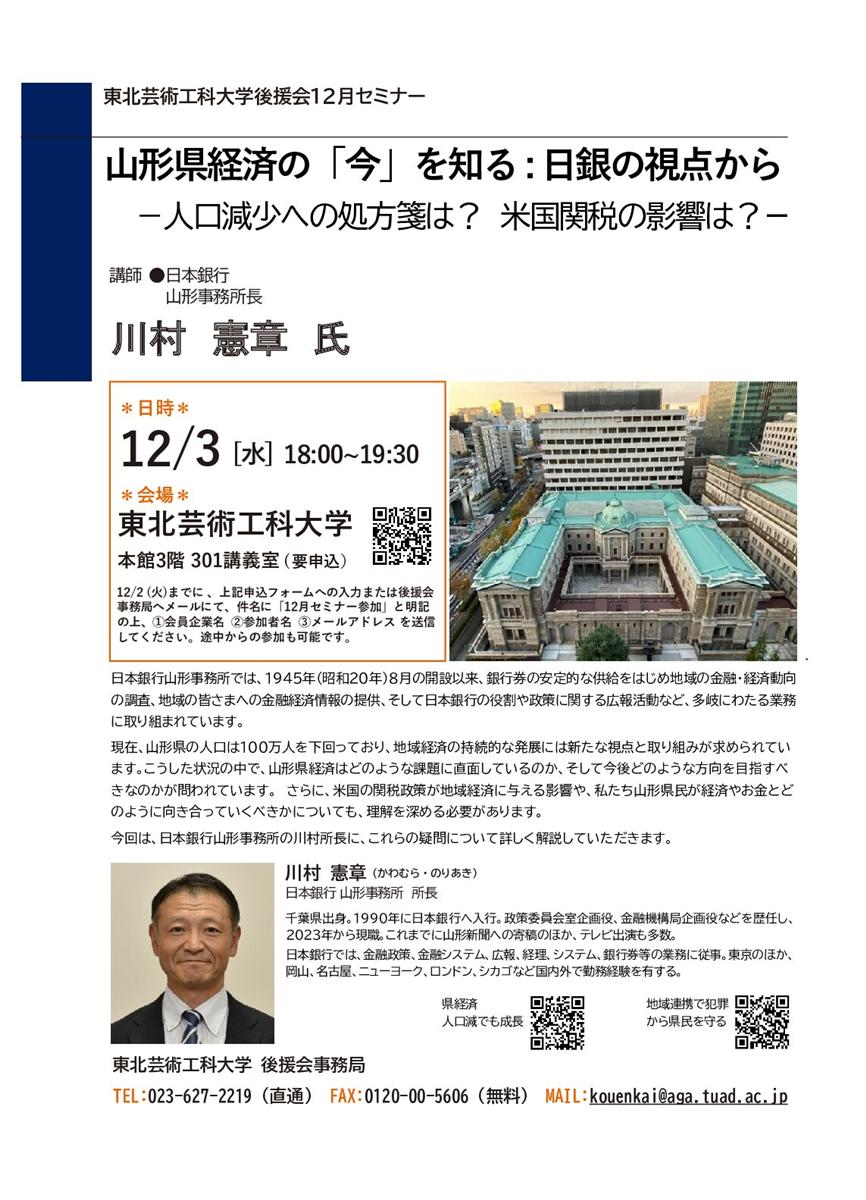 東北芸術工科大学後援会では、会員企業を対象に、経済・教育・地域課題など多彩な分野をテーマとしたセミナーを定期的に開催しています。 日本銀行は、日本の中央銀行として金融政策や物価の安定を担い、地域経済の調査・分析にも大きな役割を果たしています。今回は、山形県が直面する人口減少問題や、米国経済の動向が地域に及ぼす影響など、県内企業にとって関心の高いテーマが取り上げられる予定です。 セミナーは、12月3日(水)18時より、東北芸術工科大学 本館3階・301講義室で開催されます。会員企業の皆さまはもちろん、関心のある方はぜひこの機会にご参加ください。