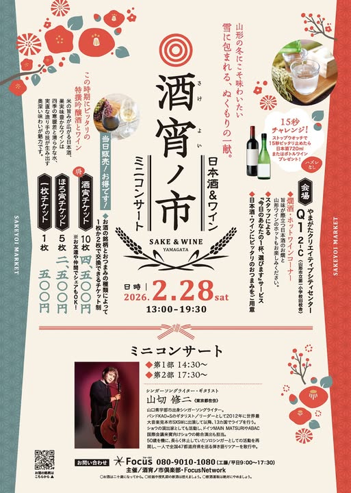 暦の上では春ですが、まだまだ雪深い山形。そんな冬こそ味わいたい、ぬくもりのあるイベントが開催されます。 会場は、やまがたクリエイティブシティセンターQ1(旧第一小学校)。 特撰吟醸酒や果実味豊かなワインに加え、旨味が際立つ「お燗」や「ホットワイン」をご用意してお待ちしております。 当日は、国内外で活躍するシンガーソングライター・山切修二さんをお迎えし、弾き語りミニコンサートも開催(①14:30~ ②17:30~)。 お酒のアテにぴったりなおつまみと共に、心地よい音楽をお楽しみください。 <お楽しみ企画> ストップウォッチで15秒ピッタリ止めたらボトルワイン等をプレゼントする「15秒チャレンジ」も実施します! 【開催概要】 ■日時:2月28日(土) 13:00-19:30 ■会場:やまがたクリエイティブシティセンターQ1(2-C) ■料金:チケット制(当日販売のみ) ・酒宵チケット(10枚):4,500円 ※お得です! ・ほろ宵チケット(5枚):2,500円 ・バラ売り(1枚):500円 ※チケットはお仲間とシェア可能です。 ★お酒の銘柄は順次HPにて紹介いたします 皆様のご来場を心よりお待ちしております。 |