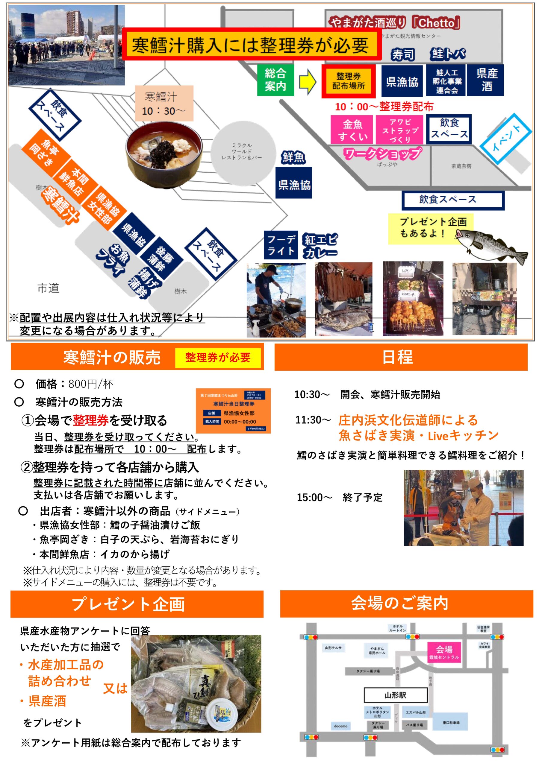 山形市霞城セントラルに庄内浜の冬の味覚が大集合。寒鱈汁は本場庄内から「県漁協女性部」、「魚亭岡ざき」、「本間鮮魚店」が出店。 ■日時:2/7(土)10:30~15:00 https://www.pref.yamagata.jp//140033/shonaihama/r7kandaramatsuri.html |