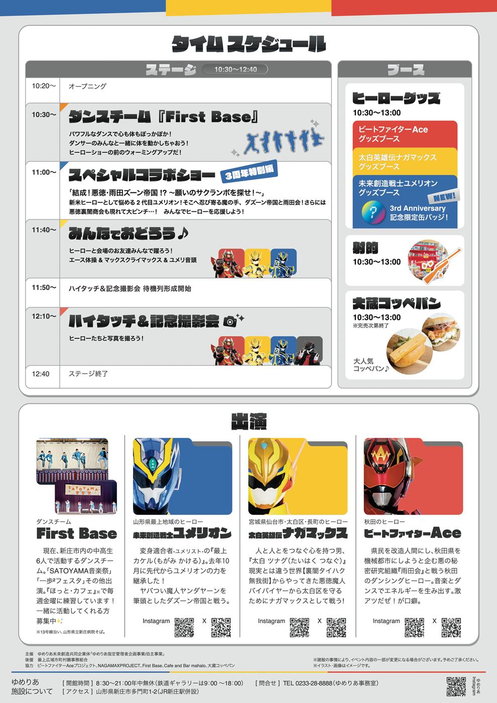 10:20~ オープニング 10:30~ダンスチーム『First Base』ステージ 11:00~ご当地ヒーロー スペシャルコラボショー(3周年特別編) 11:40~ヒーローと会場のお友達 みんなでおどろう♪ 11:50~ハイタッチ&記念撮影会 待機列形成開始 12:10~ハイタッチ&記念撮影会 12:40 ステージ終了 |