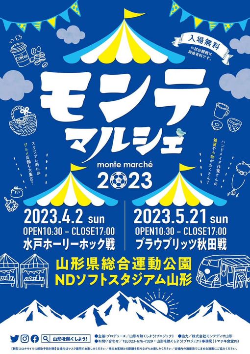 モンテマルシェ2023 【出店者募集のお知らせです】 ※募集開始日時は4/15日(日)18:00です! 沢山のご応募お待ちしております。 サッカーJ2モンテディオ山形× 山形を熱くしよう!プロジェクト コラボ開催するマルシェが開催になります! NDソフトスタジアムでのホームゲームには毎回4、5000人を超える多くのサポーターの方がいらっしゃり盛り上がっています。 ○5月21日(日)ブラウブリッツ秋田戦 山形総合運動公園NDソフトスタジアム山形 (モンテディオ山形ホームゲーム) 5/21(日)→ 10:30〜17:00 (キックオフ14:00) ーーーーーーーーーーー 【出店募集開始】 ★4月15日(日)18:00開始 ーーーーーーーーーーー ※締切4/20(木)23:59 ーーーーーーーーーーー 【募集内容】 ハンドメイド作家、雑貨販売、小物販売など 飲食以外の出店者様を募集させていただきます! ※今回、飲食出店は募集しておりません。 (ジャムなどの加工品販売は出店OKですが加工品を1点でも販売される場合は出店料が2500円+売り上げの10%となりますのでご注意下さい。) ーーーーーーーーーーーー 【出店募集条件】 ・出店料4,000円(当日支払) ・今回飲食店は募集しておりません。(加工品は可) ・出店スペースは3m ・テント、イス、テーブル等すべて各自持参お願いします。 ⭐︎屋外での出店となります。風が強い時期なのでテントには必ず4つ足に重りをつけて対策お願いします。(地面アスファルト) ・出店売り上げを出店料支払い時に必ず報告お願い致します。 ※募集数/最大30店 ーーーーーーーーーーーー 【出店応募方法】 ①出店名 ②代表者氏名 ③代表者電話番号(当日連絡のつく携帯) ④出店ジャンル・商品(出来るだけ詳しく) ⑤希望出店日(両日歓迎) ⑥搬入車の車種、ナンバー . ①〜⑥を明記してDMにて ご応募ください。 ーーーーーーーーーーー 搬入車ナンバーの書き方 例) ホンダ う ○○-○○ (スタジアム搬入道路に入る為に必要です) ーーーーーーーーーーー 【注意事項】 ★加工品を販売される場合は必ず事前に申し出ください。 ※申出がなく販売された場合は以後の出店をお断りさせていただく場合があります。 ★搬入経路、駐車場は出店が決まりました作家さんへご連絡させていただきます。 ★搬入時、駐車場での事故につきまして主催者は責任を負いかねますんで充分お気をつけ下さい。 ーーーーーーーーーーーー 【出店搬入時間】 4/2(日)8:30〜10:30 5/21(日)8:30〜10:30 (撤収は17:00〜可能となります) 【キャンセル料】 ★雨天時も開催のため出店者様判断でのキャンセル料は40%の1,600円となります。 ★また開催まで1週間をきってからのキャンセル料も40%となります。 (尚、主催者判断で開催不可能と判断した場合にはキャンセル料はいただきません) ※お振込みの場合、振込手数料は出店者様負担。 ーーーーーーーーーーーー ※5月21日開催につきましては、応募件数により2次募集も行う可能性があります。 ★山形を熱くしよう!Instagram★ |