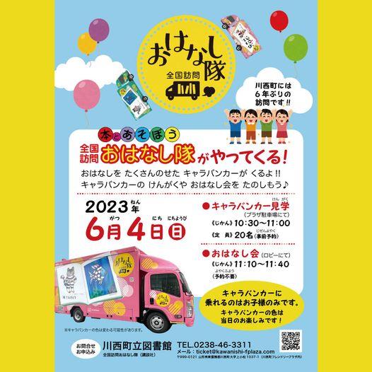 本とあそぼう 全国訪問おはなし隊がやってくる! 川西町には6年ぶりの訪問です!! 開催◆2023年6月4日(日) 時間◆10:30〜11:00(キャラバンカー見学) 11:10〜11:40(おはなし会) 場所◆川西町フレンドリープラザ・駐車場/ロビー ★参加費無料 (キャラバンカー見学のみ事前予約をお願いします) 見学とおはなし会両方に参加してくれたお友達にはおみやげがあるよ! ※キャラバンカーに乗れるのはお子様だけです。 ※キャラバンカーの色は当日のお楽しみです。 おはなしを たくさんのせた キャラバンカーが くるよ!! キャラバンカーの けんがくや おはなし会を たのしもう♪ |