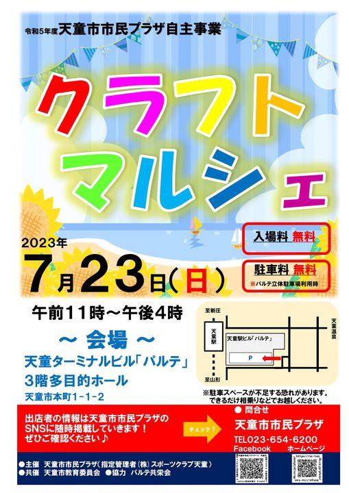 「クラフトマルシェ」のご案内です。 天童市市民プラザでは、7月23日(日)「クラフトマルシェ」を開催します。 クラフト作家の思いが込められ、創意工夫した手づくりの品物を展示・販売します。 物を大切に長く使い続ける良さを実感していただきたいと思います。 ************************* 天童市市民プラザ自主事業 「クラフトマルシェ」 ●期 日 令和5年7月23日(日)午前11時~午後4時 ●会 場 天童ターミナルビル「パルテ」3階 多目的ホール ●入場料 無料 ●駐車場 無料(パルテパーキング立体駐車場のみ) ※出店していただける方も同時募集中です。電話又は、ダイレクトメッセージ、メールなどでお問合せください。 (担当・水戸部) お問い合わせ 天童市市民プラザ TEL.023-654-6200 |