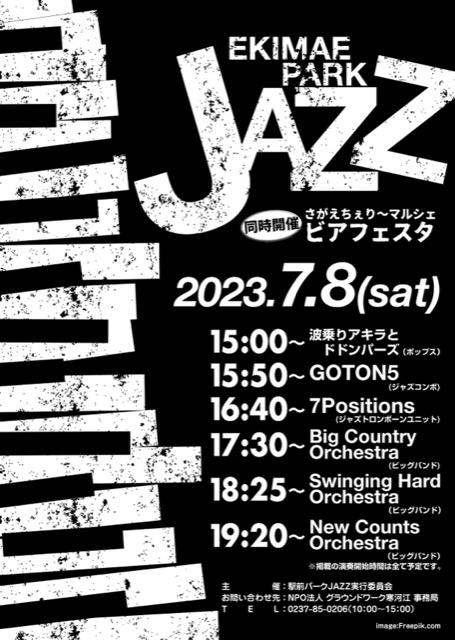 中心市街地のにぎわい創出と、芸術文化の振興に資する事を目的とする事業として取り組んでいる「駅前パークJAZZ」が、今年復活開催です! 出演者多数のため、今回はこれまでよりも早い15時からスタート。 さがえちぇりーマルシェビアフェスタも同時開催ですので、生ビールと美味しい料理、熱いJAZZの生演奏で盛り上がりましょう! 駅前パークJAZZ 2023 期日:2023年7月8日(土) 場所:寒河江駅前みこし公園 1.波乗りアキラとドドンパーズ(ポップス) 15:00~15:40(40分) 2.GOTON 5(ジャズコンボ)15:50~16:30(40分) 3.7Positions(ジャズトロンボーンユニット)16:40~17:10(30分) 4.Big Country Orchestra(ビッグバンド) 17:30~18:10(40分) 5.Swinging Hard Orchestra(ビッグバンド)18:25~19:05(40分) 6.New Counts Orchestra(ビッグバンド)19:20~20:00(40分) |