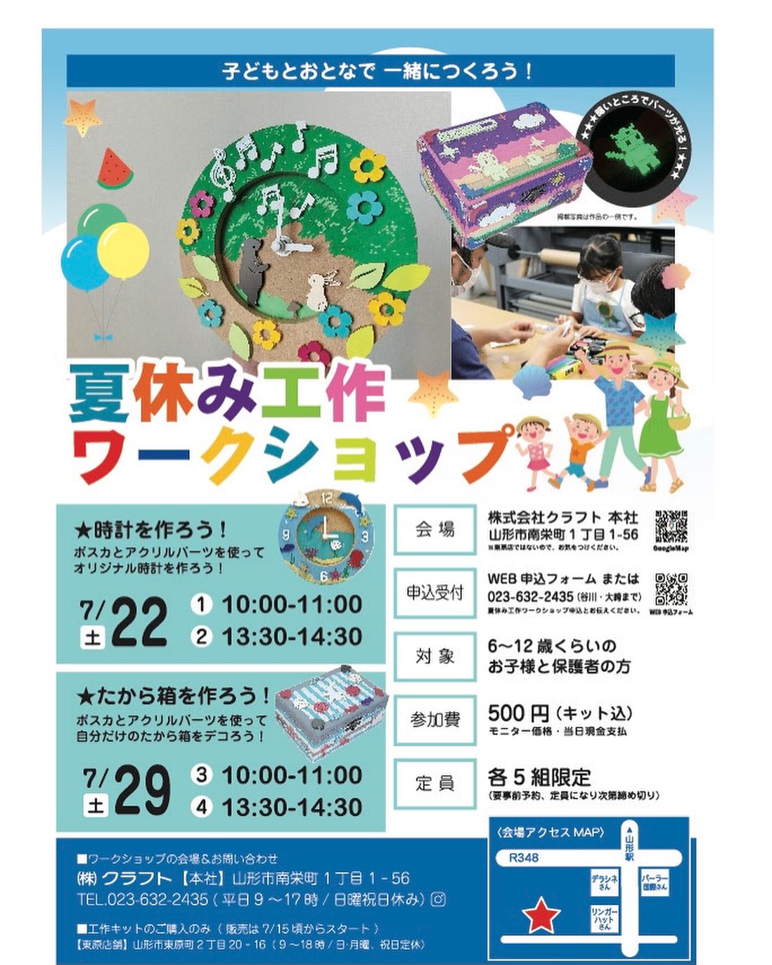夏休みワークショップ参加者募集 . . こんにちは!クラフトのクラちゃんです . まもなく夏休み突入! クラフトのワークショップに参加して かわいい時計を作りませんか? . 時計を作ろう! ①7/22(土)10:00〜 ②7/22(土)13:30〜 . 参加費:500円(キット込)モニター価格 申込み:Web申込みフォーム(https://onl.bz/eaz67UD)または023-632-2435(谷川・大崎まで) 持ち物:スリッパなどの内履き . ご参加お待ちしてます . ![]() ------------------------------------------- 株式会社 クラフト 本社/山形市南栄町1丁目1-56 TEL:023-632-2435 店舗/山形市東原町2丁目20-16 TEL:023-631-0570 |