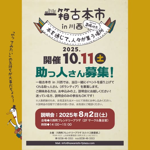 本好きによる1日だけの古本市\一箱古本市in川西2025/本を通じて、人々が集う場所開催◆2025年10月11日(土)時間◆10:00〜15:00会場◆川西町フ […]