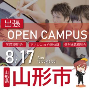 このイベントは終了しました 要予約 FREE 山形市 08/ 17 代々木アニメーション学院 出張 体験型オープンキャンパス 2025/08/17(日) 13時00分 ~ 17時00分 #代々木アニメーション学院 #学校説明会 #山形市