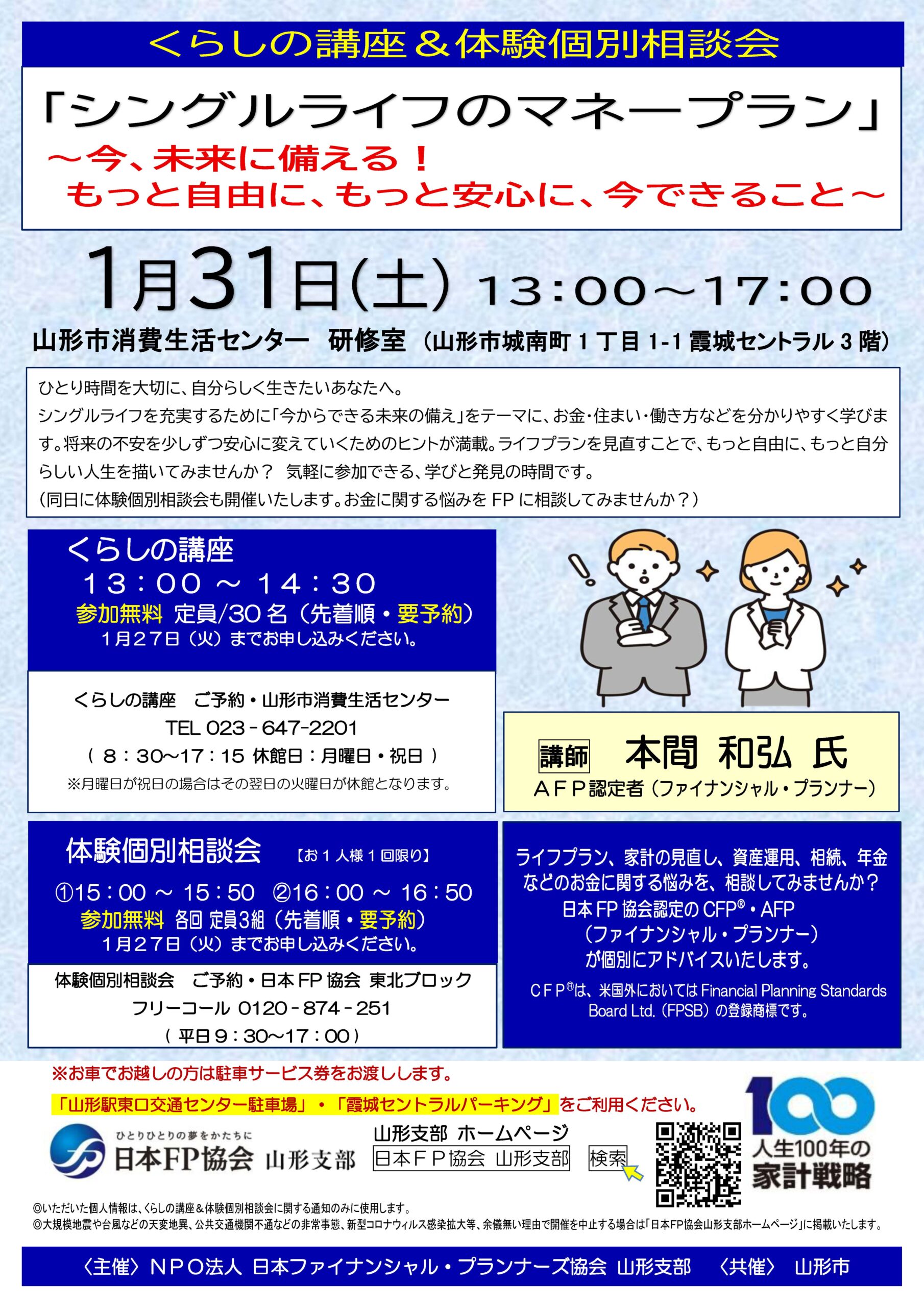 要予約 FREE 山形市 01/ 31 くらしの講座&体験個別相談会 ライフプランセミナー 2026/01/31(土) 13時00分 ~ 17時00分 #シングルライフ #セミナー #家計管理 #山形市 #相談会